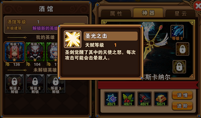 每个英雄都有对应的神器和神器技能,提升英雄能力的一个非常重要的途径就是解锁该英雄的神器。当我们解锁了神器技能后,就可以获得相应的能力。如:增强攻击力和防御力、附带额外属性、获得新技能等。当然,并不是解锁了就完事,如果想要更加强大,我们还可以对神器技能进行进阶。无论是解锁神器还是进阶神器都是需要消耗各种不同的神器强化材料。 卍解:努力吧!骚年~