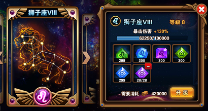 当我们在世界探索攻打其他玩家主城胜利后就可以获得一个胜利宝箱,开启后就可以获得升级星云的祭品。装备高等级的星云,获得的属性加强是巨大无比。(如下图,8级狮子座星云+130%暴击伤害,这是何等的逆天)