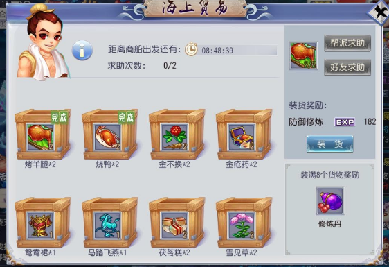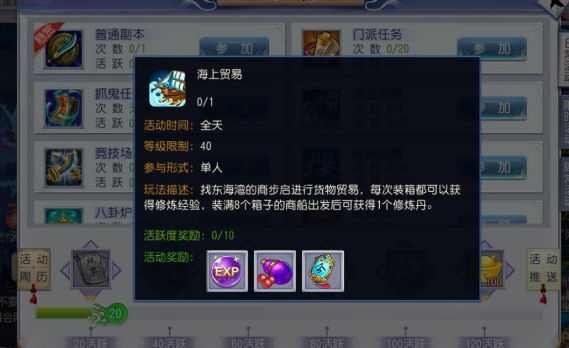 帮助东海湾的商步启货物装满货物,就会增加一定的修炼经验,增加的修炼经验可以设置默认的修炼升级,每个箱子都是431修炼点经验,就是相当等于完成我们海上贸易就会得到431*8=3448点修炼经验,而且还会送你一个修炼丹,是不是很划算的一个任务呢?小编亲身经历全是比我们游戏内直接点修炼要划算很多,但是由于一天只能做一次!!所以小编在这里推荐每日必做!