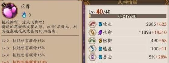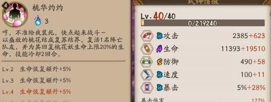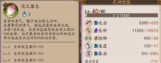 复活技能,满级为目标复活并回复桃花妖生命上限的24%。且只有2回合的CD。该技能使桃花妖作为一个专职奶妈存在,成为唯一一个有复活技能的治疗式神。