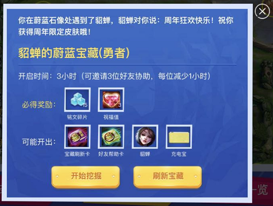 3.好友帮助卡:可通过【使用好友帮助卡】来减少开启宝藏的时间;此外,玩家可通过点击挖掘中的宝藏界面“+”通过邀请好友协助来减少开启时间,协助别人挖宝自己也可以获取祝福值哦~~