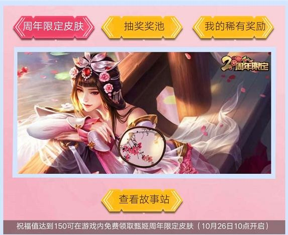 当挖宝攒取的祝福值达到150点的时候即可免费获得甄姬周年限定皮肤了,皮肤将在10月26日10:00之后开放领取!