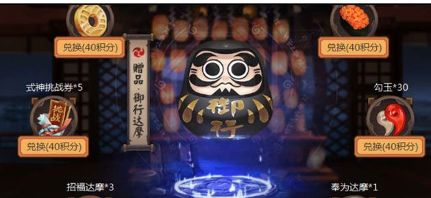 包括了6种道具每个需要40积分,兑换总计240分获得一个御行达摩。