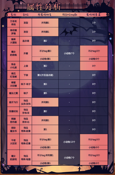属性分析的目的主要是看衣服有没有成为未来关卡顶配的潜力。目前使用三个指标:全属性排名、同部位同tag的衣服数量、还有属性是否被覆盖(即其它衣服属性和它完全一样、甚至更高),有tag的衣服还会同时考虑各tag和不计tag下的情况。不过不少很有潜力的衣服到现在也还没有成为顶配的机会,也只能作为参考!(思路是兔子提供的)