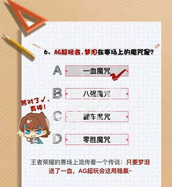 首页 → 安卓游戏资讯 → 安卓游戏攻略 → AG超玩会梦泪在赛场上的魔咒是 王者周年电竞小考卷答案分享