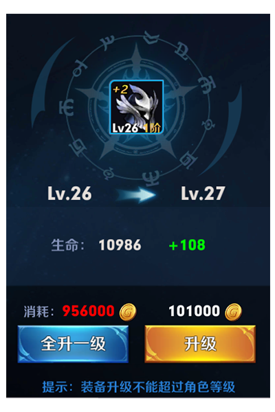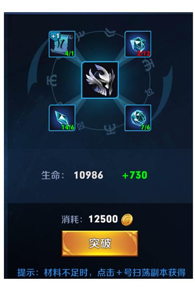 消耗突破材料,来完成对装备的突破,提升装备品质,装备有白、绿、蓝、蓝+1、蓝+2等多个品阶,品阶影响装备的外观、属性和等级上限。