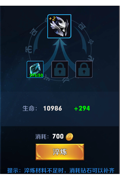 3、淬炼:提升装备的淬炼星级(1星—16星),增加装备星星数,获得淬炼属性加成。