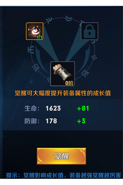 4、觉醒:改变装备前缀名字,普通装备获得百分比属性加成,特饰可激活技能