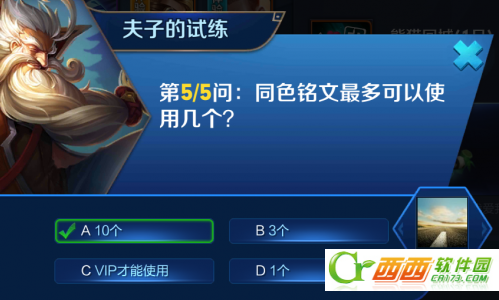 以上就是王者荣耀同色铭文最多可以使用几个,夫子的试练答题答案,请大家继续关注。