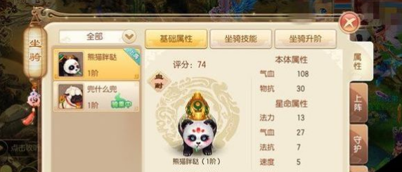 坐骑拥有一定的属性,这些属性可以通过上阵操作增加到角色身上,为玩家带来相应的战力提升。不同的坐骑所增加的属性也不相同,因此不同门派适合搭配的坐骑也各不相同。熊猫胖哒的基础属性分为本体属性以及星命属性。正如它可靠的外形一样,熊猫胖哒的本体属性偏于防御,能为玩家带来一定的气血以及物抗的加成。而它的星命属性也不例外,在法力、气血法抗、速度以及法暴方面都有加成。总体来看,熊猫胖哒属于血耐坐骑,它在气血以及双抗方面的属性可以为玩家带来防御上的全面提升,相对来说更适合天音门派的玩家上阵,进行持久战。当然也适合输出足够但自身血量较少的门派,如青云等。