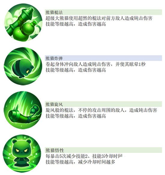 三招技能涵盖了直线伤害、范围伤害以及控制,可谓是十分全面。同时,超级大熊猫还拥有被动“熊猫悟性”,攻击时每暴击5次便可减少“熊猫炸弹”、“熊猫旋风”的冷却时间,大大增加了技能的连贯性,加快了对敌人的控制、伤害频率,令对手难以招架。
