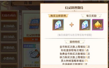 类似月卡存在的料理御侍会员礼包,非常实惠,购买后每日可以获得幻晶石(钻石)和灵火种奖励