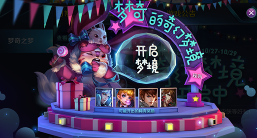 召唤师们好,10月27日~10月29日,只要连续三天在游戏内点击【开启梦境】参与活动,必有一天获得永久英雄/皮肤/皮肤碎片*20的圆梦大礼!