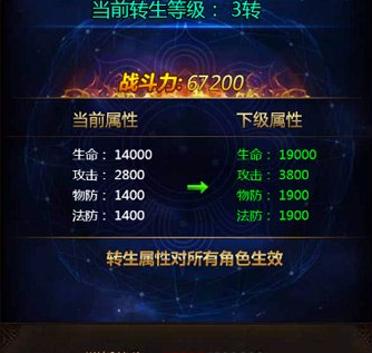 转生系统,则是一个角色最重要的蜕变方式了,通过消耗修为的方式提升转生等级,能够大幅度提升角色的基础属性,要注意的是转生同时对所有角色生效哦。