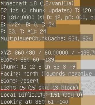 而在1.8版本中,F3的信息中倒数第三行为你的脚所在格子亮度信息,这变得更方便。其中Light表示合成亮度,sky为自然光源亮度,block为非自然光源亮度,为了使作物不受自然光照降低的影响,你只要保证block亮度>=9即可。