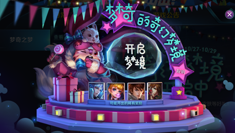 召唤师们好,10月27日~10月29日,只要连续三天在游戏内点击【开启梦境】参与活动,必有一天获得永久英雄/皮肤/皮肤碎片*20的圆梦大礼!