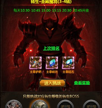 难度最高的转生BOSS,不仅对于玩家的入场资格有着限定,而且只在固定时间开放,攻略难度极高,需要所有强者齐心协力才有机会成功,最终的奖励可是有着极为珍贵的主宰碎片哦。