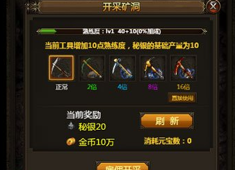 在矿洞进行开采的时候,可以刷新升级自己的工具,从而获得更高的收益,同时熟练度越高,秘银材料的产出也就越多,想要得到更多的秘银还可以直接掠夺其他玩家。