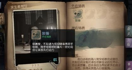 狡猾:慈善家,不知道为何却随身携带手电筒,用手电筒照射屠夫一定时间会让其丧失行动力(这个一定时间很危险啊,说不定没等时间好屠夫已经把你击倒在地了,个人觉得这个技能最好在屠夫出钩伤人一次后使用,应为这个时候屠夫有个小小的硬直时间,站着不动让你照)
