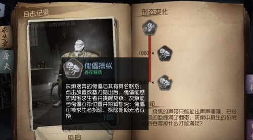 灰烬摆弄的傀儡与其有莫名联系,点击放置或者蓄力抛出后,傀儡能感应周围求生者并提醒灰烬,灰烬能与傀儡互换位置并且短暂加速,傀儡可以被求生者拆除,拆除期间无法互换。(感觉很强的技能啊,探视野+瞬间移动,可怕)