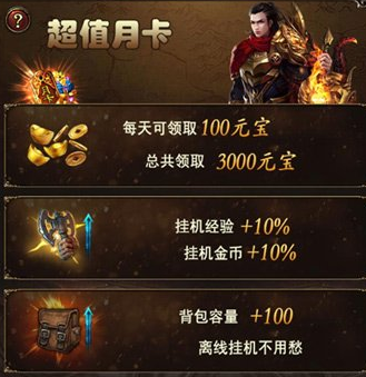 新手玩家在初入游戏的时候,有余力的话开通月卡就是非常好的选择了,不仅能够提升经验和金币的获取速度,增加背包格子,并且每天还可以领100元宝的奖励,为我们快速提升奠定了良好的基础。