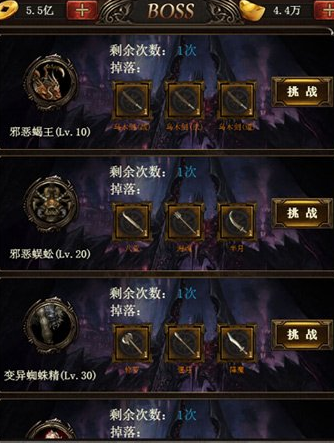 个人BOSS:玩家单人挑战挑战,每天挑战1次,凌晨0点刷新次数,玩家达到相应的等级可以开启相应的BOSS挑战,能够获得多种装备。