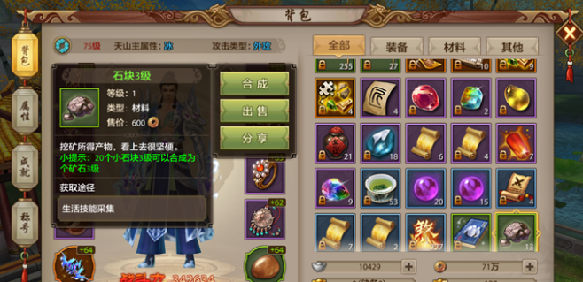 少侠们可以通过采集获取布料、石块、碎皮和线头。如果我们不用这些材料打造装备,那么卖钱也是不错的选择,不过有时候材料不是很好卖,比如当大家等级提高之后,低级的材料在商会中几乎就卖不出去了。但是即使我们不卖银两,也可以将材料直接卖成铜币。比如3级的基础材料,需要20个合成一个可用的打造材料,而20个初级材料每一个都能卖600铜币,20个就是12000铜币。如果大家采集得够多,卖商店也能赚一笔小钱。