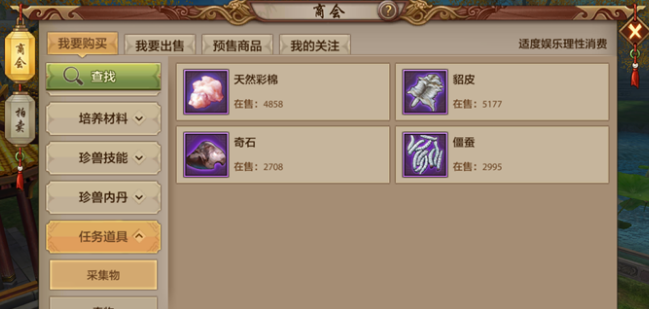 采集过程中有概率获得稀有采集物,比如天然彩棉、貂皮、奇石和僵蚕。而这些采集物我们可以出售成铜币(一个5万铜币),也可以在商会出售(一个1000银两),不过在后期,买得人不是很多,所以大部分的用处,都是卖成铜币,或者是在跑环与帮会任务时消耗。建议少侠不要全部卖掉,留下少量采集奇物做任务,特别是帮会任务的稀世之宝任务,经常会需要这些特殊任务道具。