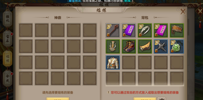 如果少侠不想卖掉这些材料,那这些材料还有啥用呢?那就是打造成装备了,在等级较低时,打造符是过剩的,我们只要有打造材料,就可以打造出非常多的装备,如果打造出低星装备,就直接熔炼增加神木鼎的灵力。