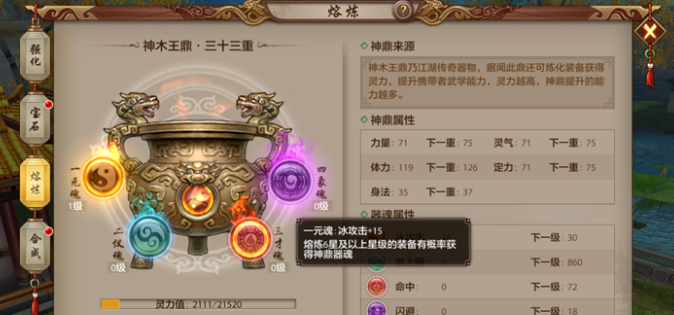 如果打造出高星装备,是可以商会出售,不过等级过低的装备可能没人买,那我们就使用熔炼功能将高星装备熔炼,这样有可能获得器魂,而获取器魂可以增加大量少侠战斗力,器魂加的属性都非常实用,分别为少侠带来主属性攻击、血上限、命中与闪避的加成。