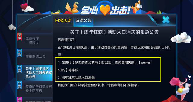 然后是梦奇梦境出现BUG,官方暂时关闭,并且也牵连到了峡谷寻宝,目前也被关闭修复!今天晚上熬夜做活动的小伙伴都被坑了!