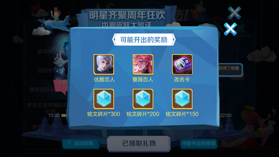 打开礼物有几率永久内测专属皮肤(嬴政-优雅恋人和孙尚香-蔷薇恋人)或其他奖励(铭文碎片*150,铭文碎片*200,铭文碎片*300,改名卡等)。