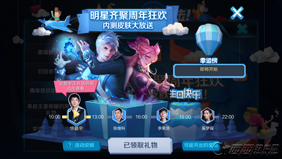 从10月28日上午10点到22点,每隔3个小时,就会有一位嘉宾送来祝福和礼物,玩家在这个时间段可以开启TA的礼物,有几率获得永久内测专属皮肤(嬴政-优雅恋人和孙尚香-蔷薇恋人)或其他奖励(铭文碎片*300,铭文碎片*200,铭文碎片*150,改名卡)中的任意一种。