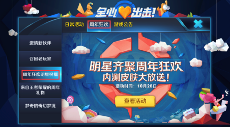 从10月28日上午10点到22点,每隔3个小时,就会有一位嘉宾送来祝福和礼物,玩家在这个时间段可以开启TA的礼物,有几率获得永久内测专属皮肤(嬴政-优雅恋人和孙尚香-蔷薇恋人)或其他奖励(铭文碎片*300,铭文碎片*200,铭文碎片*150,改名卡)中的任意一种。