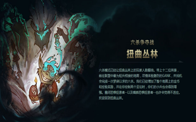 六杀模式已经让扭曲丛林上的玩家人数翻倍。带上十二位英雄,前往联盟中最为短兵相接的地图,尽情体验激烈的GANK,并找机会完成一次梦寐以求的六杀。我们已经增加了整个地图上的金币和经验奖励,并在你控制两个圣坛时,你们的小兵也会得到增强。幽闭恐惧症患者--以及蜘蛛恐惧症患者--也许会觉得不适应。欢迎回到扭曲丛林。