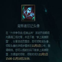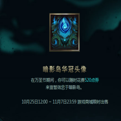 1、LOL玩家在11月1日15:00 ~ 11月13日23:59期间前往英雄联盟官网即可免费领取万圣节暗影岛奖励头像,万圣节奖励如下: