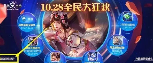 活动地点:游戏内——活动——游戏公告——【周年狂欢,英雄/皮肤大放送】——去完成——领取蛋糕碎