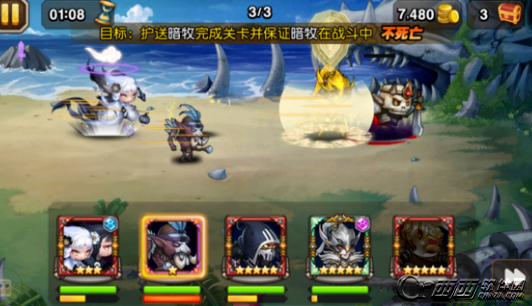 3、 第三关,难点在于打断骷髅王大招,第一次大招用天照打断,第二次有两种办法,石像鬼起飞可以打断但是可能会抓取中排,或者看走位情况,骷髅王桶不到中排,石像鬼硬抗。之后骷髅王死掉然后复活用石像鬼或者天照打断,赏金-风行-幻刺依次卡黑开大收割。