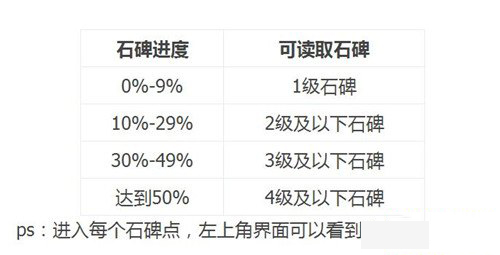 那么先说明下为什么有些石碑无法读取提示:铭文内容太过晦涩,暂时无法解读。如果遇到这个提示就说明您当前的石碑等级较高,当前阶段还无法读取,在你的石碑进度到对应进度的时候就可以读取了。石碑进度及可读取石碑等级对应关系如上图!