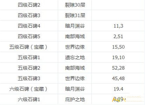 那么各等级(阶段)的石碑又分布在哪里呢?见下表: