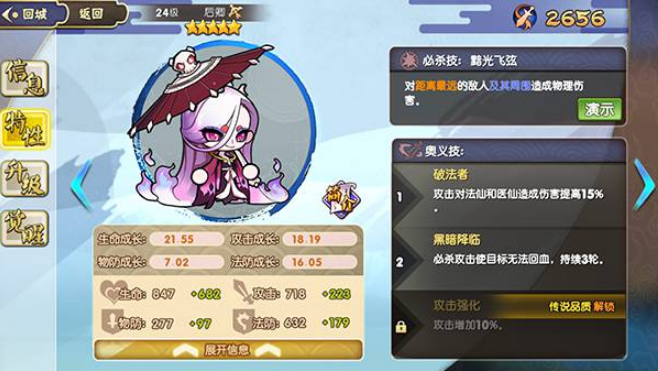 法术牌1:致命射击,对指定敌军造成60攻击强度仙法伤害,并使其无法回血,持续3轮。法术牌2:转生之魔,使后卿免疫所有致命伤害,并且每次受到攻击后,提高后卿下次攻击伤害20%。