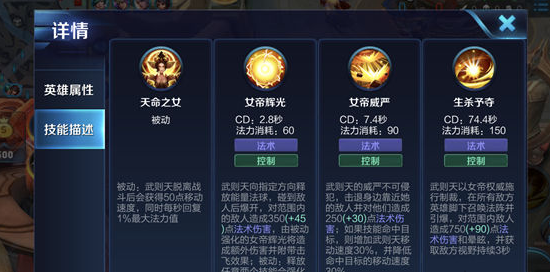 被动-天命之女:武则天在脱战后,获得移动速度加成,并持续回复自身的最大法力值。