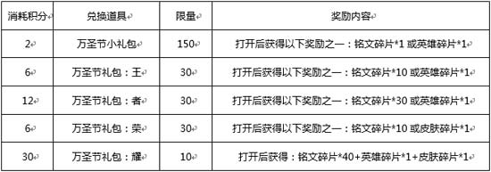 万圣节礼包:耀:铭文碎片*40+英雄碎片*1+皮肤碎片*1(消耗积分30,限量10个)
