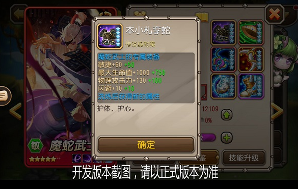 魔蛇武士觉醒装备——本小札孪蛇。生命值和闪避的提升进一步加强她的生存能力,敏捷、物理攻击力的提升使他的输出更加残暴。