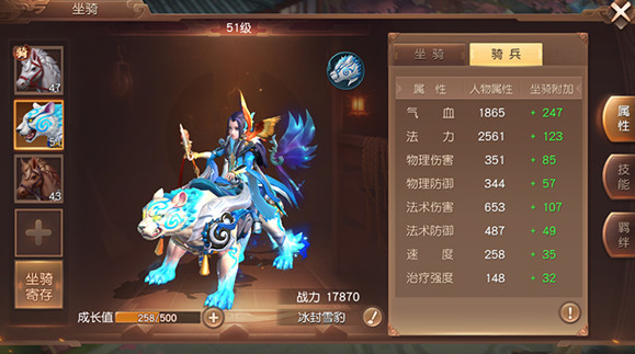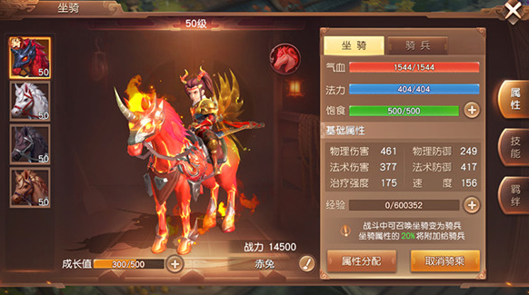 坐骑的等级是决定战力的重要因素,将坐骑设置为骑乘状态,就可以在战斗、任务中获得经验。除此之外,还可以在金币商城中购买驯兽秘术为坐骑增加经验。在达到一定等级后,坐骑与角色的羁绊将会解锁,对角色属性有一定的加成,增强玩家的整体战力。