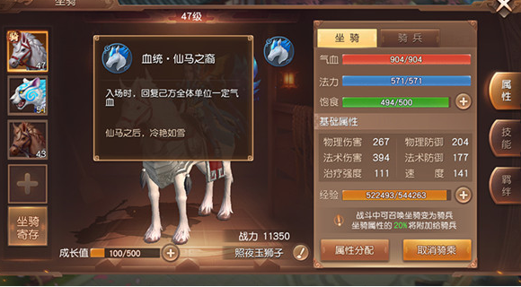 目前本版共有十余种不同的坐骑可供选择,每种坐骑都各有千秋,拥有不同的血统效果。以赵云的坐骑夜照玉狮子为例,其血统为仙马之裔,入场时可回复己方全体单位一定气血,合理把握召唤时机可以帮助玩家扭转逆势,反败为胜。