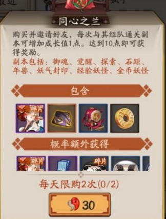 同心之兰购买并邀请好友,每次与其组队通关副本可增加成长值1点,达到10点成长值即可获得奖励。