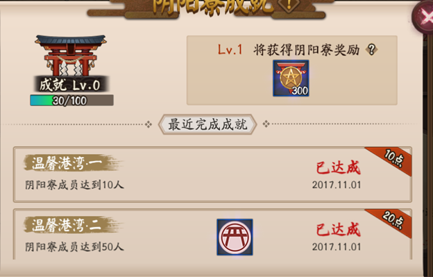 阴阳寮成就点数会提升阴阳寮成就等级,等级越高,阴阳寮奖励就越好。