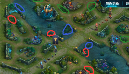 红色位劣势局常见蹲点,蓝色为前期及均势局抓人蹲点,绿色为优势抓单蹲点