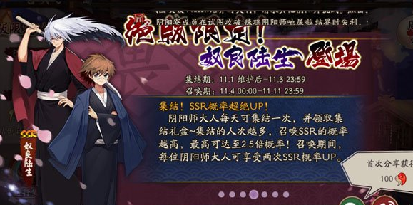 11月4日0:00-11月10日23:59,使用神秘的符咒、勾玉、现世符咒召唤,即有机会获得奴良陆生碎片,集齐50个碎片可合成绝版限定SSR奴良陆生!